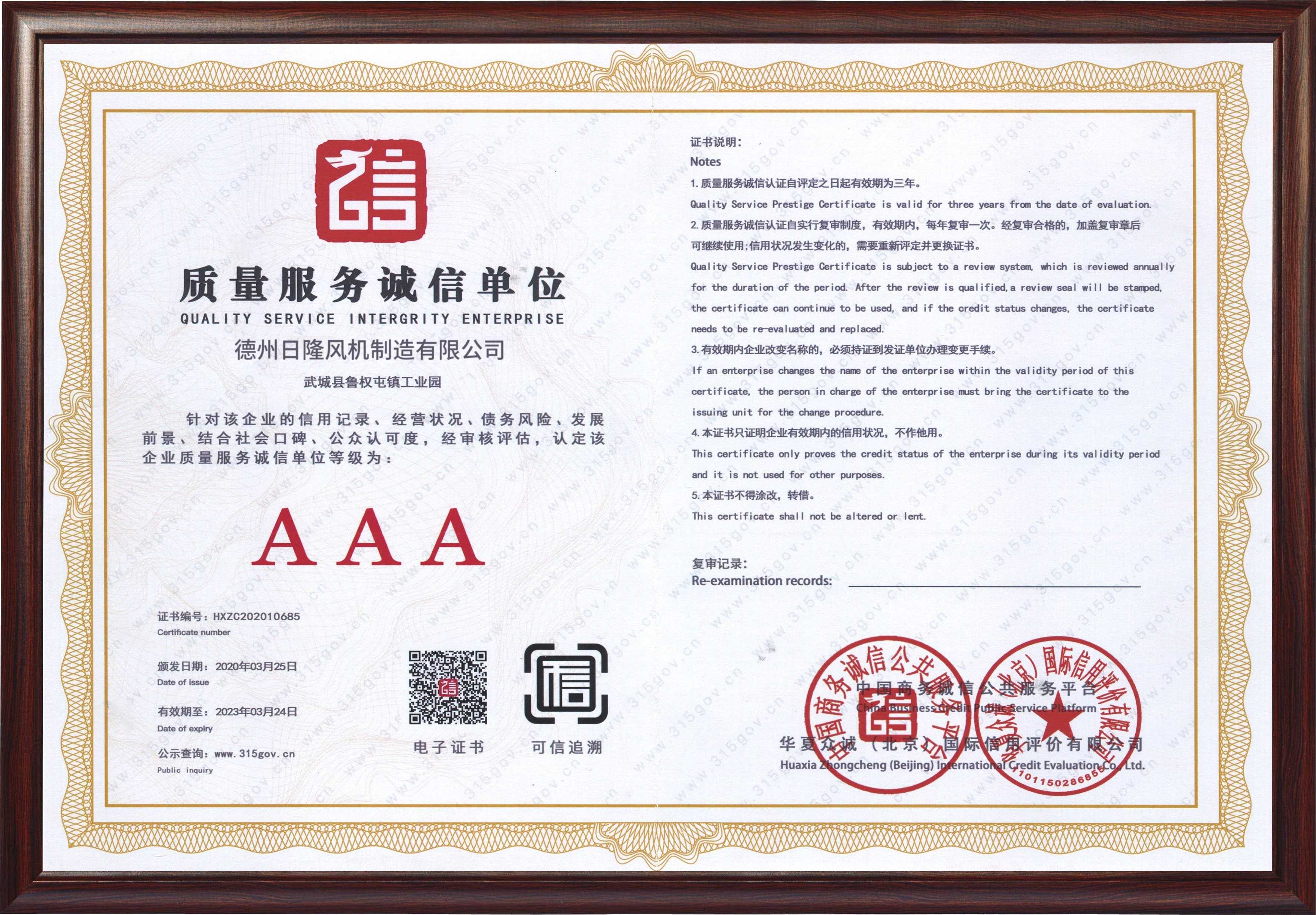 日隆風(fēng)機資質(zhì)